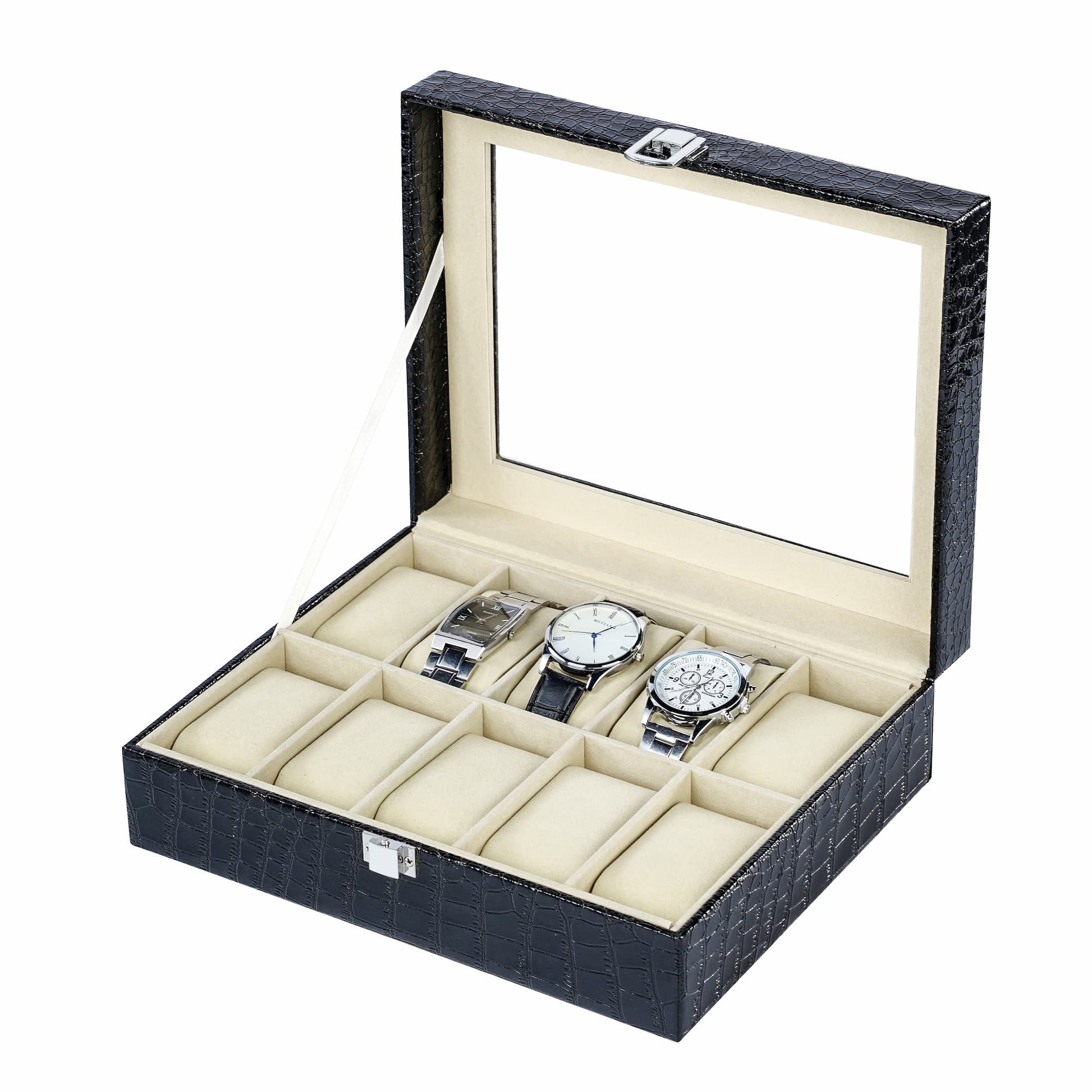 Watch Organizer Case 10 Slots Black Crocodile Grained PU Leather Watch Box With Factory Supply Price