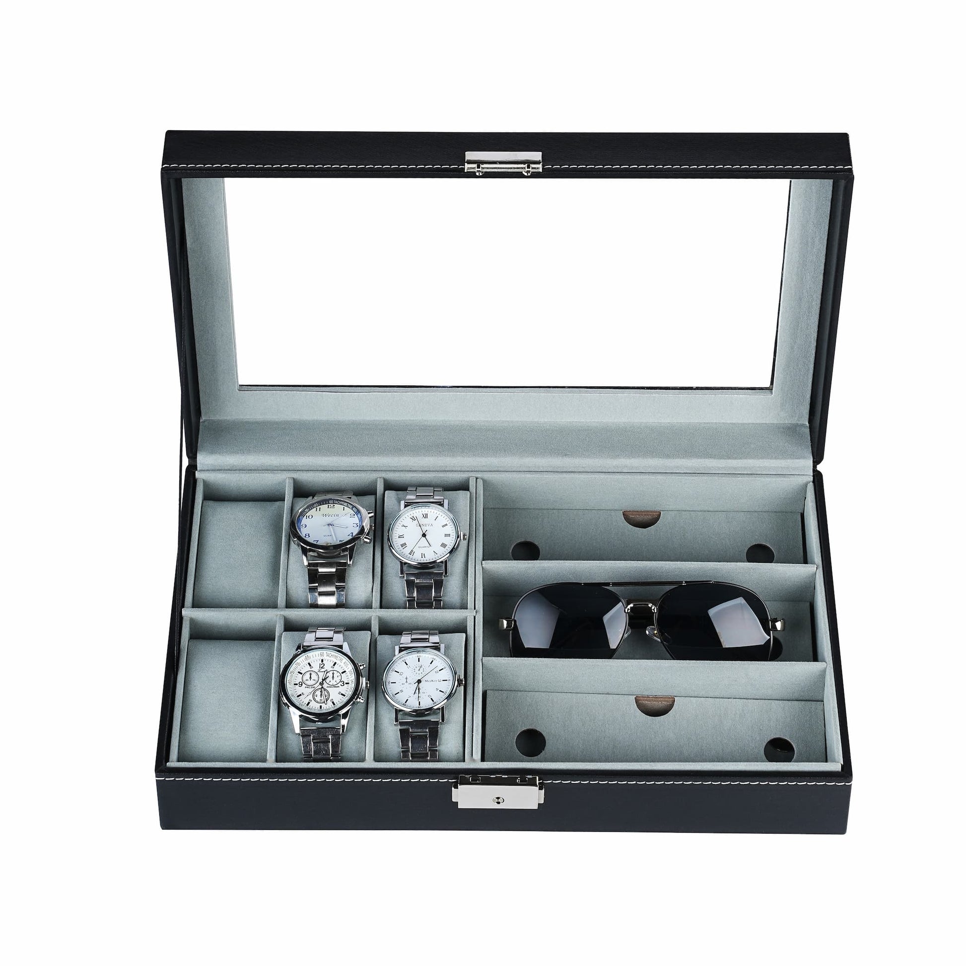 6+3 slots Black PU Leather Watch Box Sunglasses Storage Case With Soft Velvet Lining