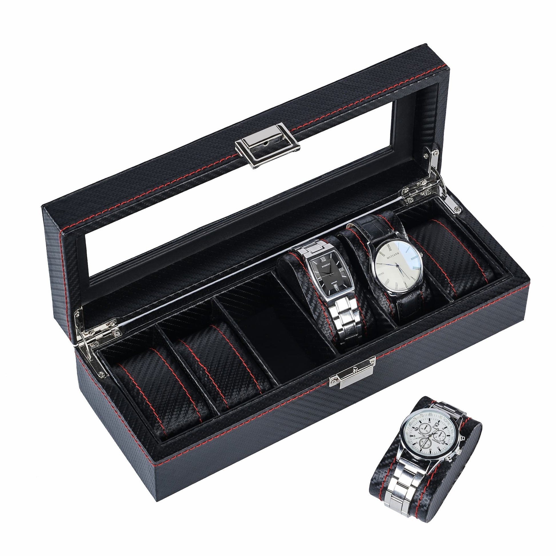 6 Slots High Quality Black Carbon Fiber Leather Wrist Watch Organizer Display Storage Box With Red Sewing