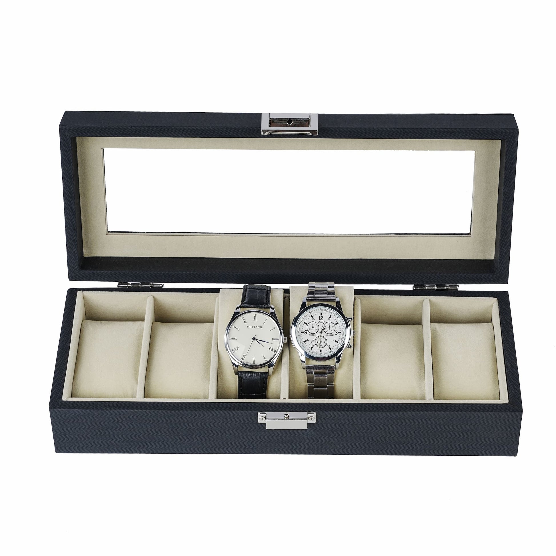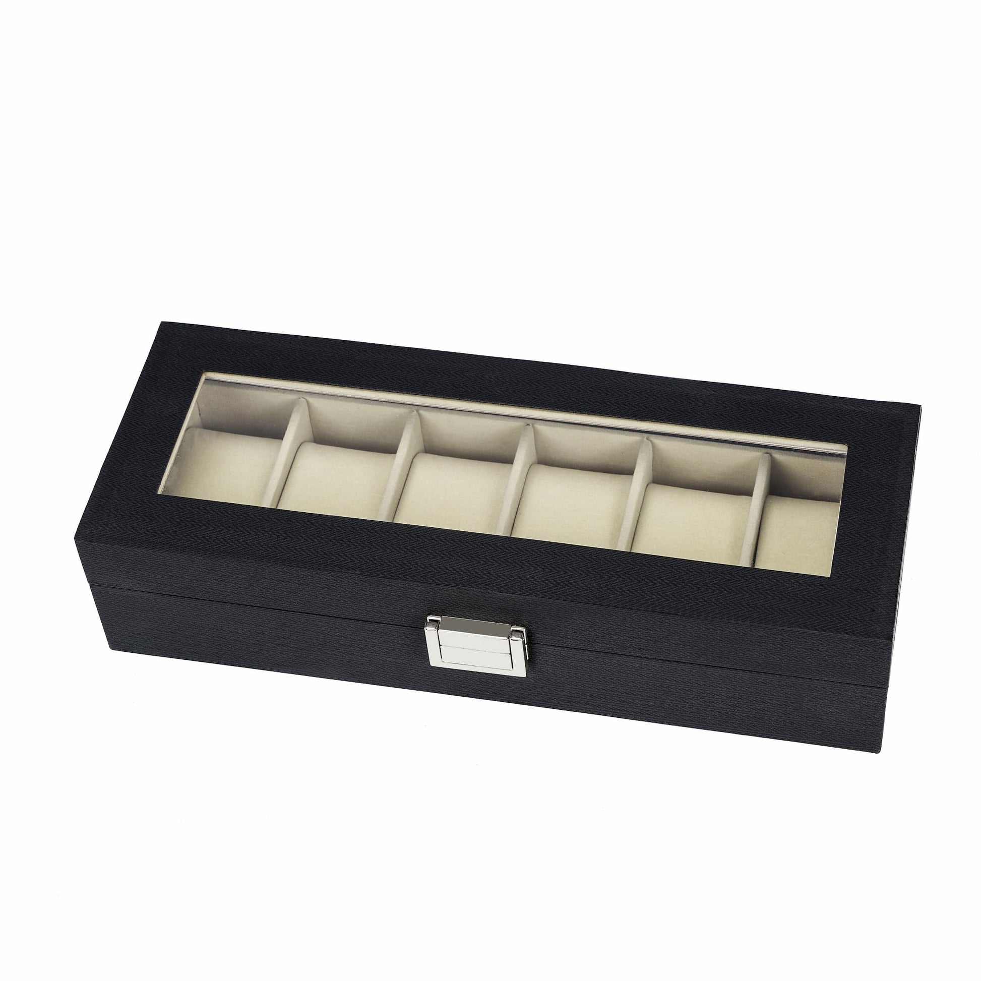 Watch Box Manufacturer 6 Slots Watch Organizer Black Herringbone Leather Watch Case With Real Glass Lid