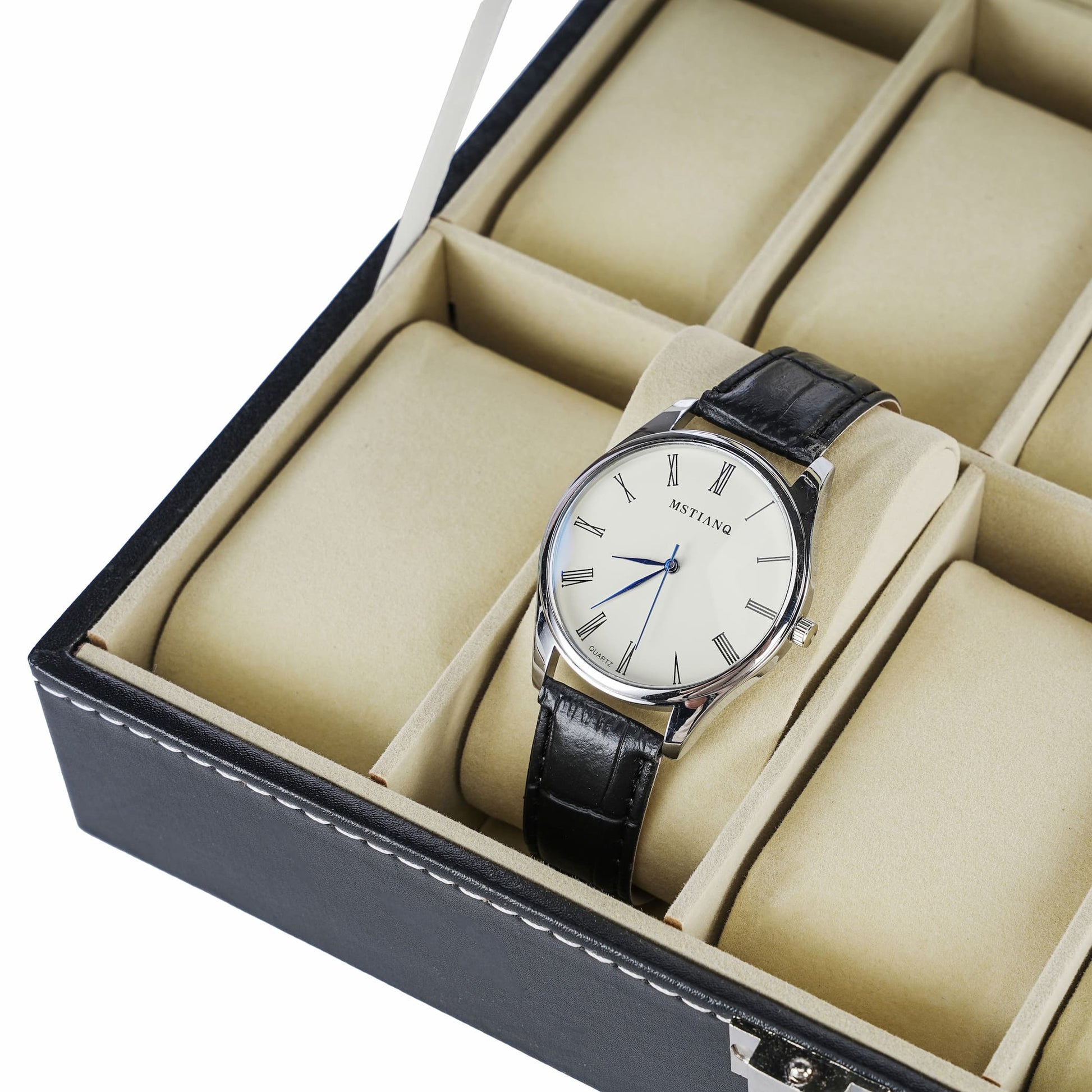 [Unique design]: 10 watch slots with removable velvet pillows, enough space between the lid and pillows to accommodate watches and well protect them against scratches.
